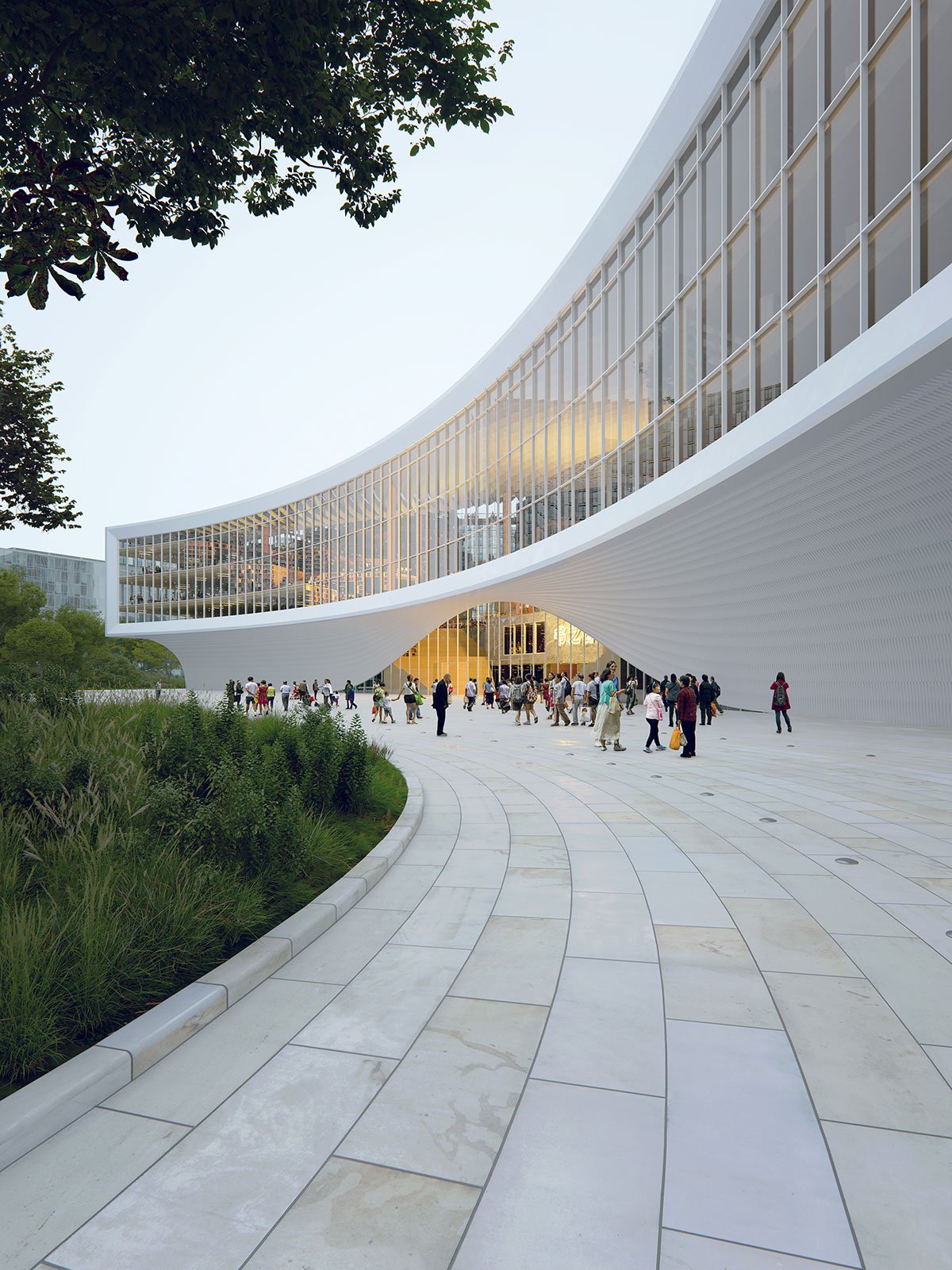 [Text as submitted by architect] MVRDV has won the competition to design a new central library for Wuhan, China. Poised to become one of the largest libraries in China, the 140,000-square-metre project combines traditional and non-traditional functions with diverse study, living room, reading, and studio spaces. The building connects to its surroundings via three large openings that will act as visual displays of life inside the building, sparking curiosity and intrigue. This distinctive, three-faced flowing shape celebrates the position of the “city of 100 lakes” at the confluence of two rivers and will become a new recognizable landmark for Wuhan.