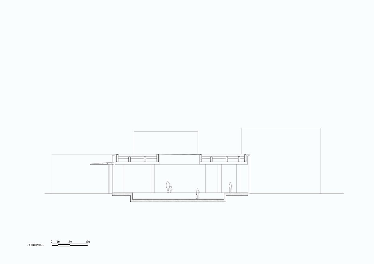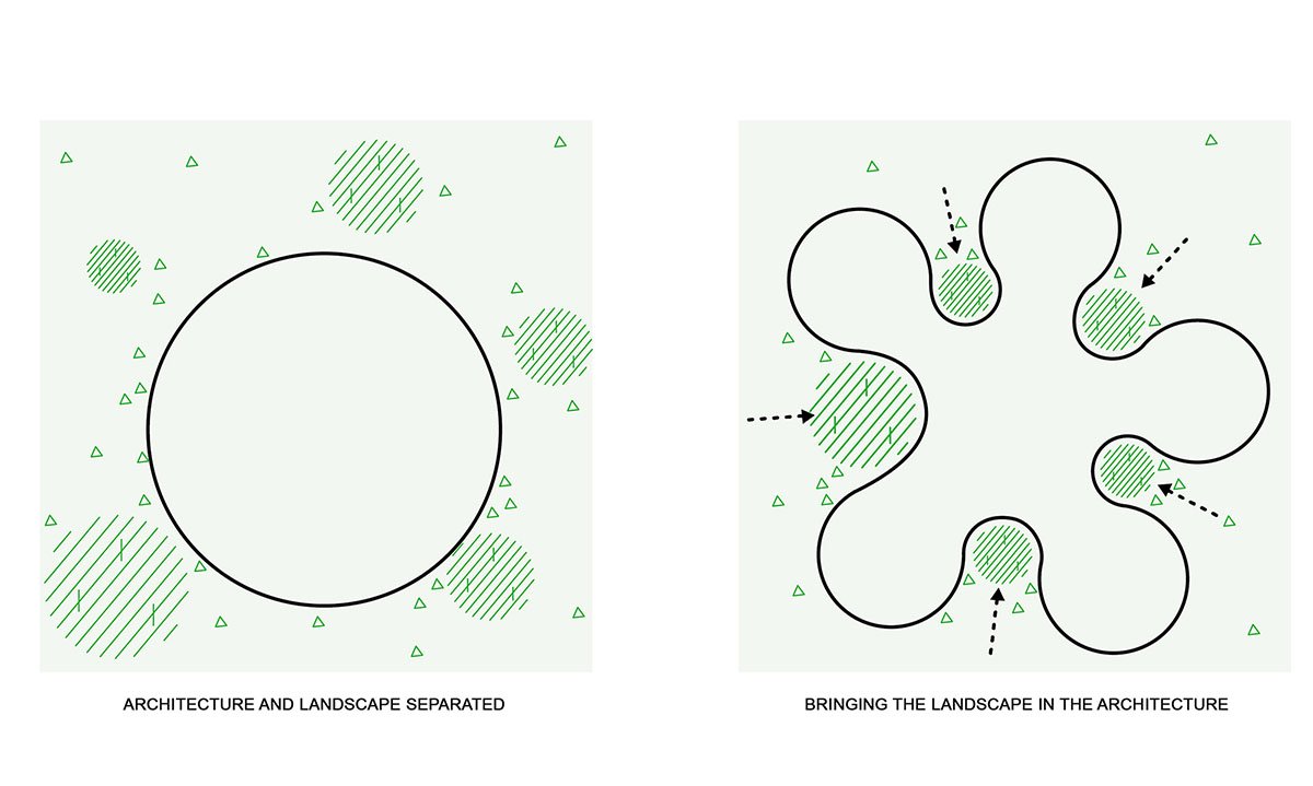 The architecture becomes unity of positive and negative spaces. Like a snow-crystal structure that can be read as a pattern in its presence or absence of matter. The landscape areas, entering the sides of the building, become part of the whole rhythmical dialogue of the exhibition spaces, bringing light to the interior space.