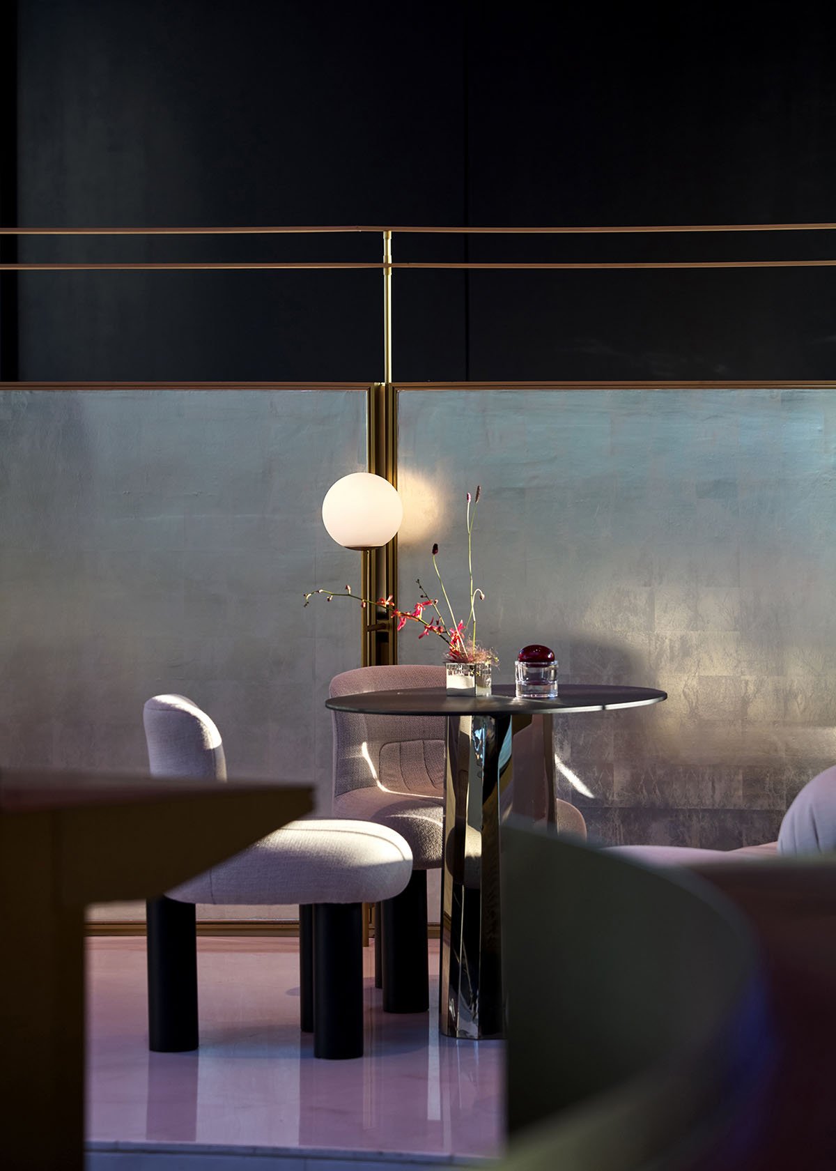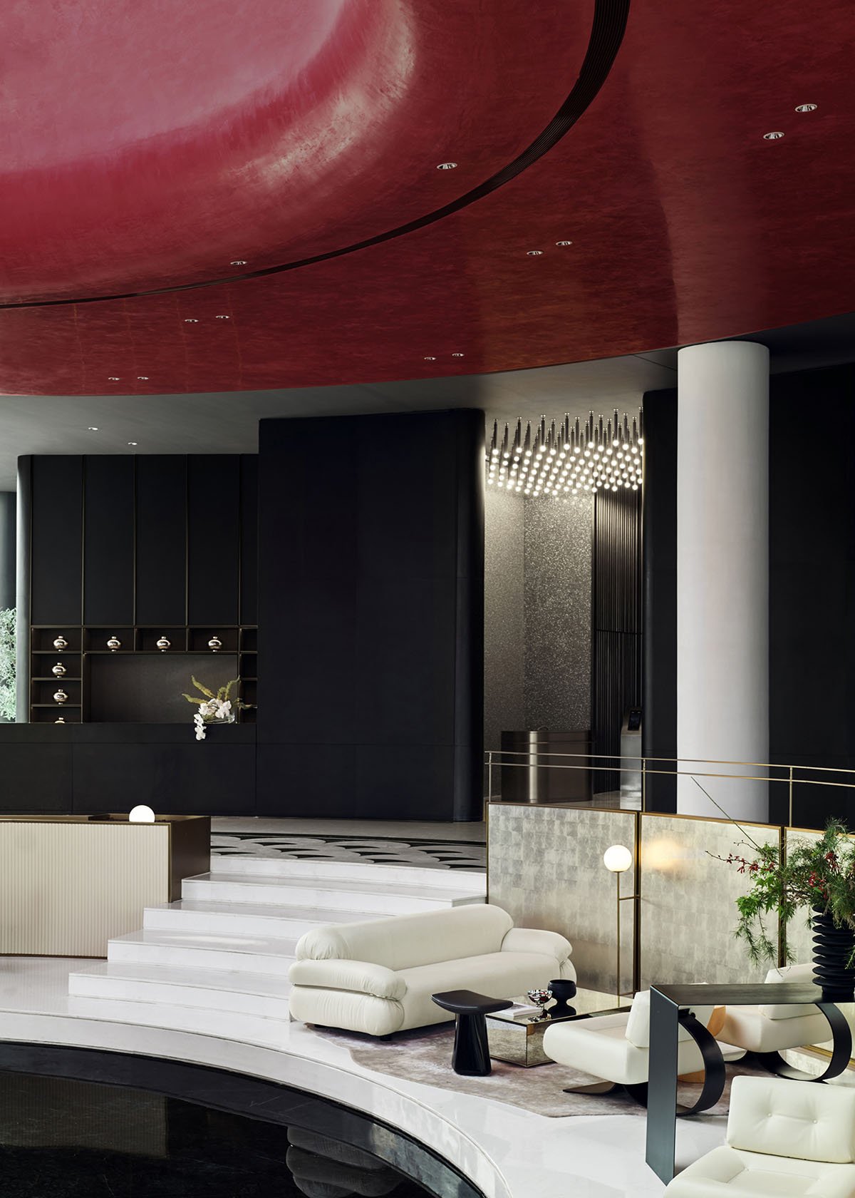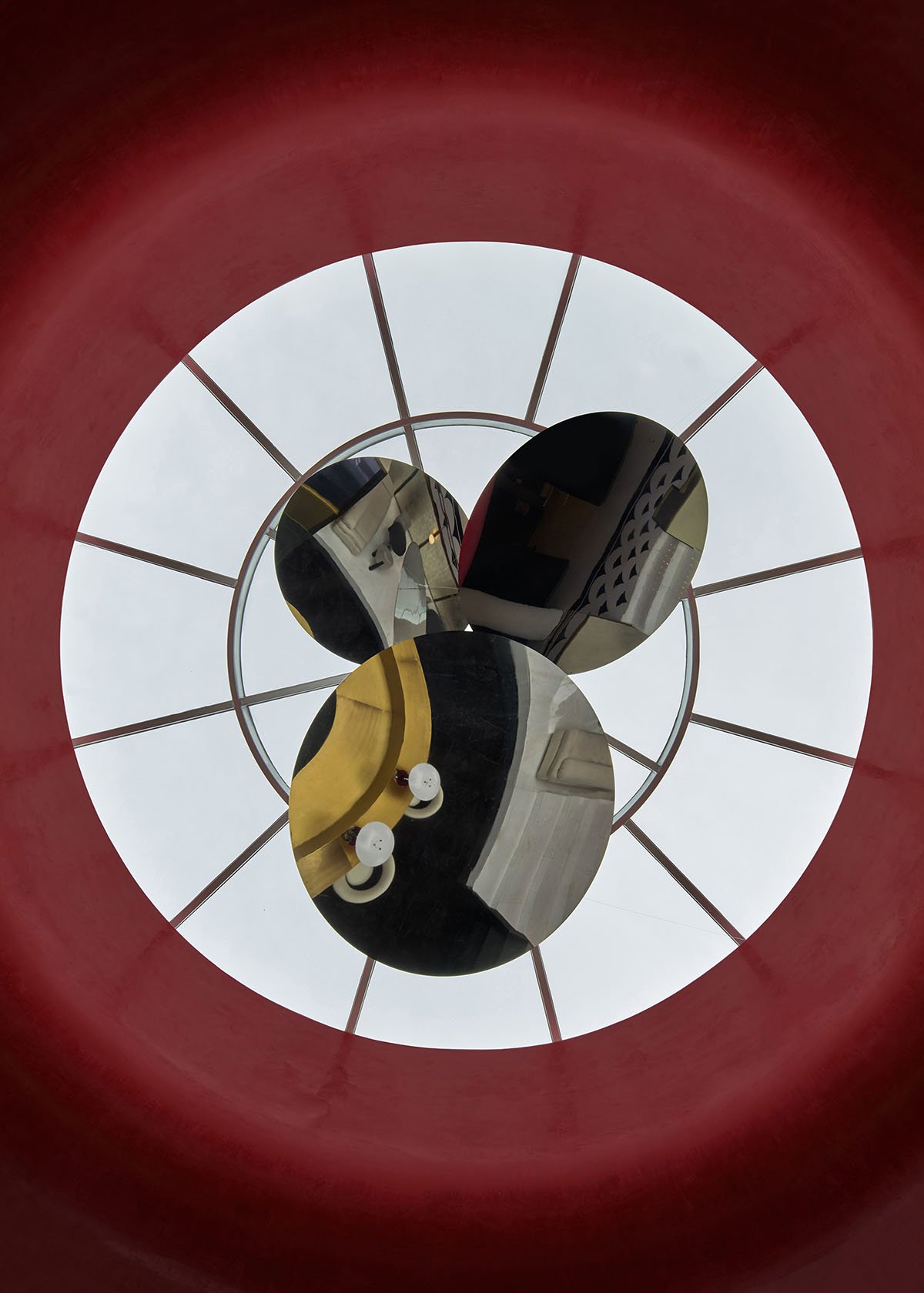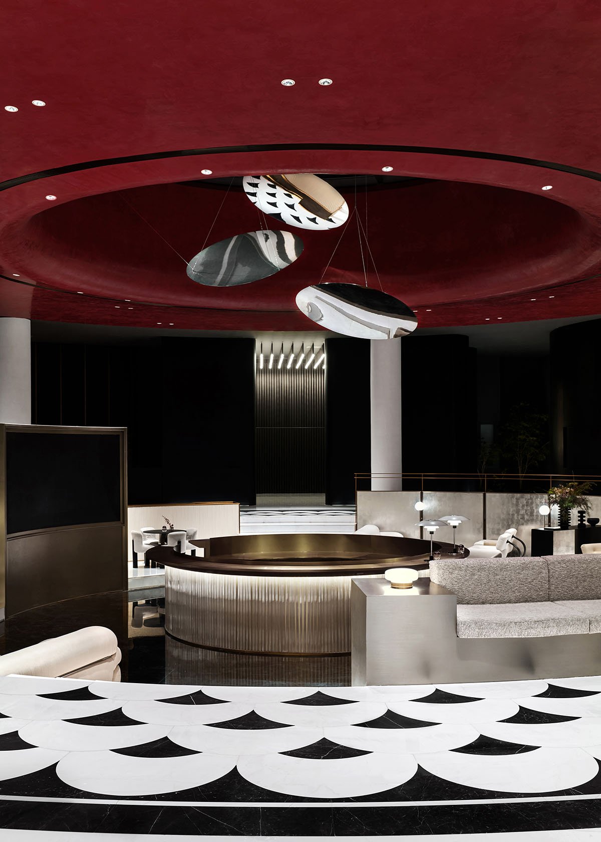 The interior functions have been conceived as a collection. As each peripheral volume is a defined space, so environments are free to evolve and create a series of unique experiences. The central space is sunk down to define the transition to the lounge area and to enhance the ceiling height. The step creates a column lined circular gallery, which encourages visual links between the different functions across the main space. The ceiling is finished in a hand painted red plaster which folds up to a central skylight above the central bar.