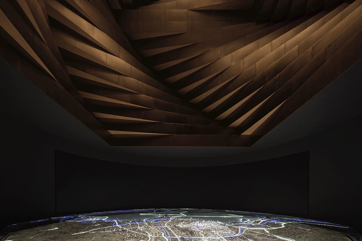 Within the largest drum volume is the city model, which reflects the urban scale of the development. A bronze square ceiling spirals upwards into the darkness and is reflected back by a mirror, in order to create the illusion of an internal tower, allusion to the ascension to the unknown, the future. In the most open part of the snow-crystal, we created a stepped amphitheater. The space is created for circular meetings, group activities and for children to play; a multifunctional space that can be adapted to different purposes. It addresses the neighborhood through its fully transparent envelope, inviting the local community to join and gather.