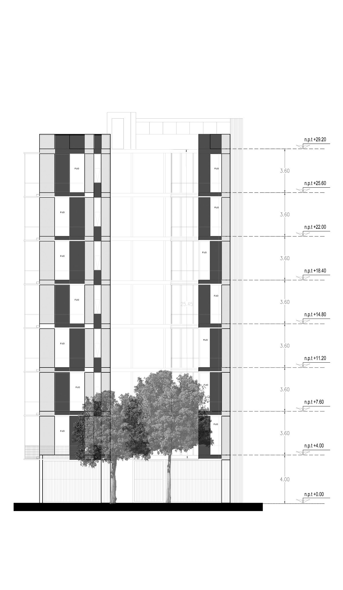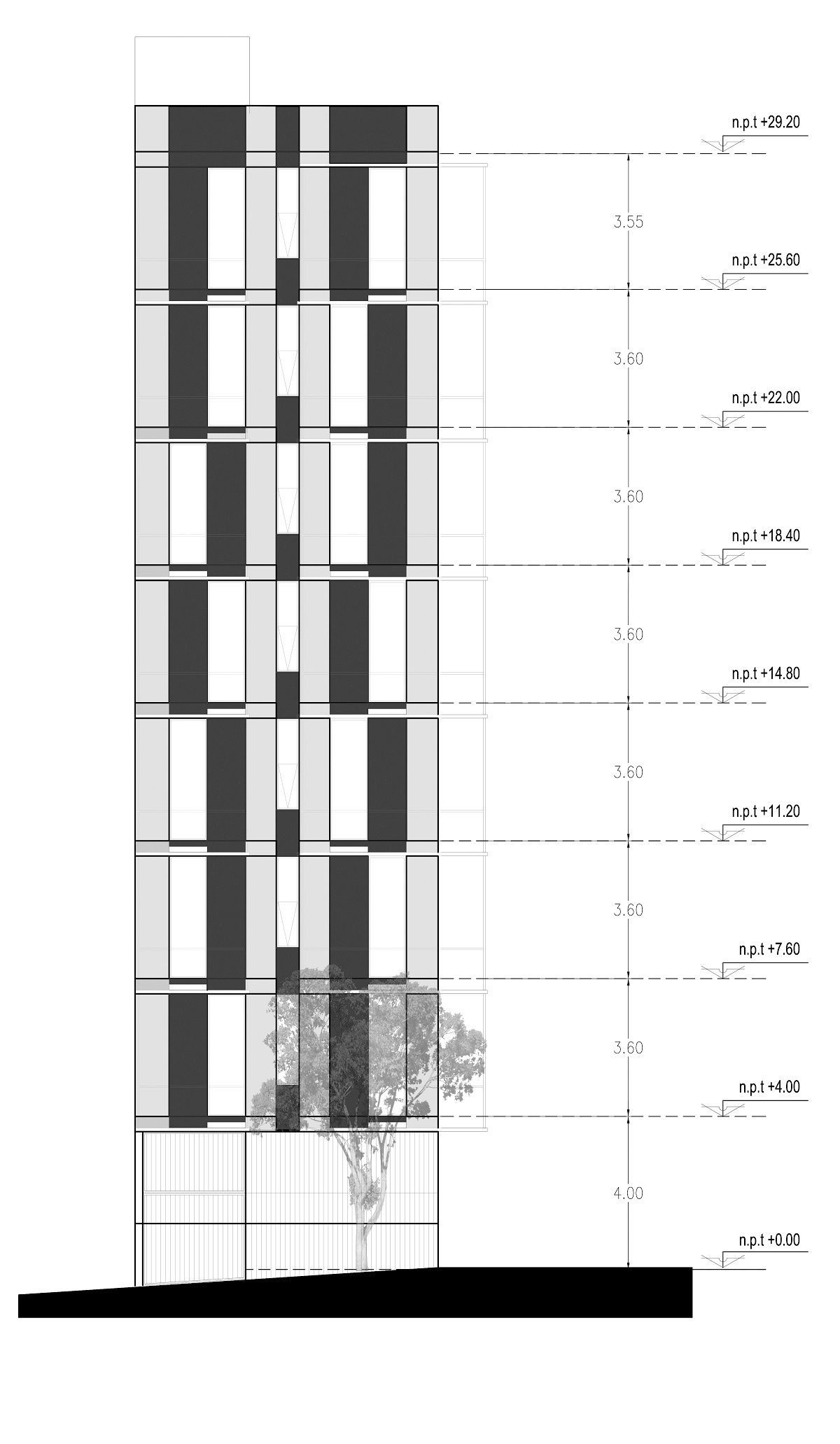 The design seeks to highlight the verticality and slenderness of the building, emphasizing a concrete monolithic design, where the color and texture of each element represent the total essence of the building. A set of two-tone concrete gussets included in the design generate a sense of dynamism and integration based on the penetration from the exterior façade to the interior areas. Additionally, multi-media materials provide contrasting colors and sensations with wood integrated into the gussets, providing warmth and comfort to interior spaces. Each of the elements, such as the vertical lines on the balconies and the staircase, add to the verticality of the building and the monolithic concept for the project. All of the selected materials that will compose the building are timeless and will naturally age according to their inherent nature. Exceptional lighting and ventilation of all the spaces are achieved, in part, by using the maximum height allowed for each of the entryways. This approach also provides an experience of spaciousness to the interior spaces and opens the views to the outside, resulting in a unique and varied city panorama view from each apartment.