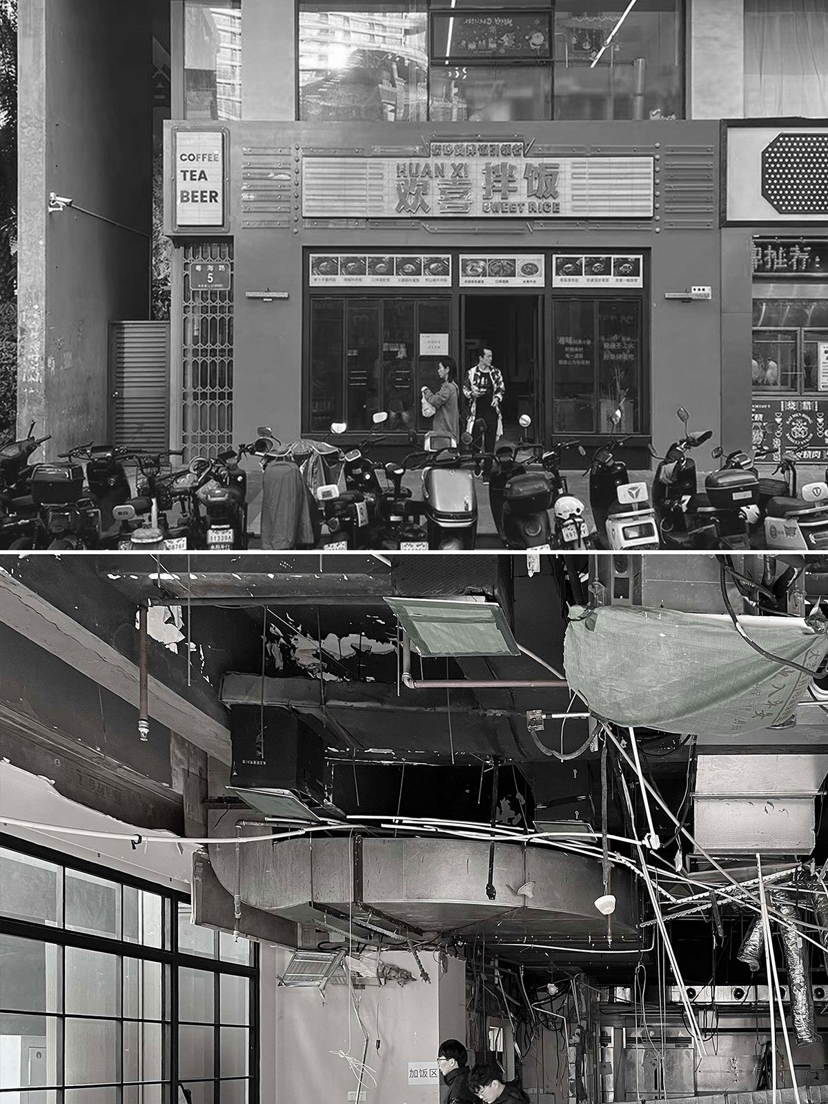 01 Symbiosis: The building stands at one end of a former gourmet street, resulting in a complex internal structure with crisscrossing water and gas pipelines. The large complicated exhaust pipe of the former kitchen occupies significant space and cannot be altered, reducing the spatial height and complicating the design process.
