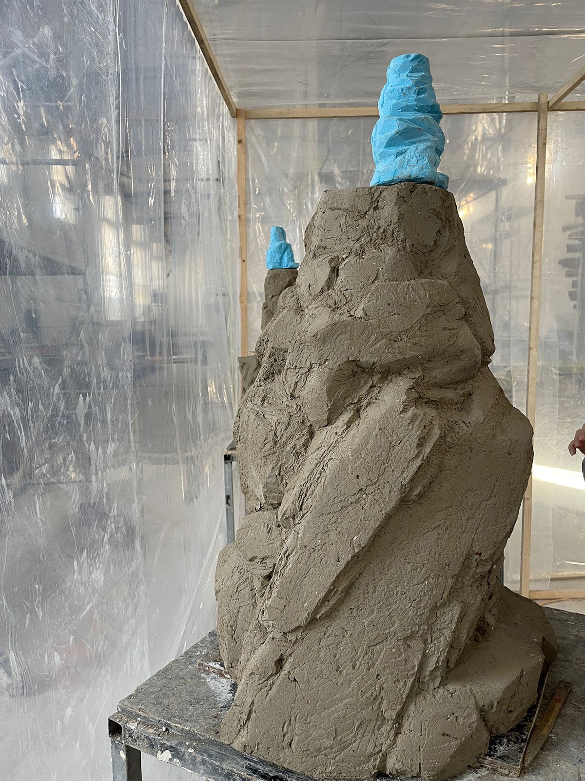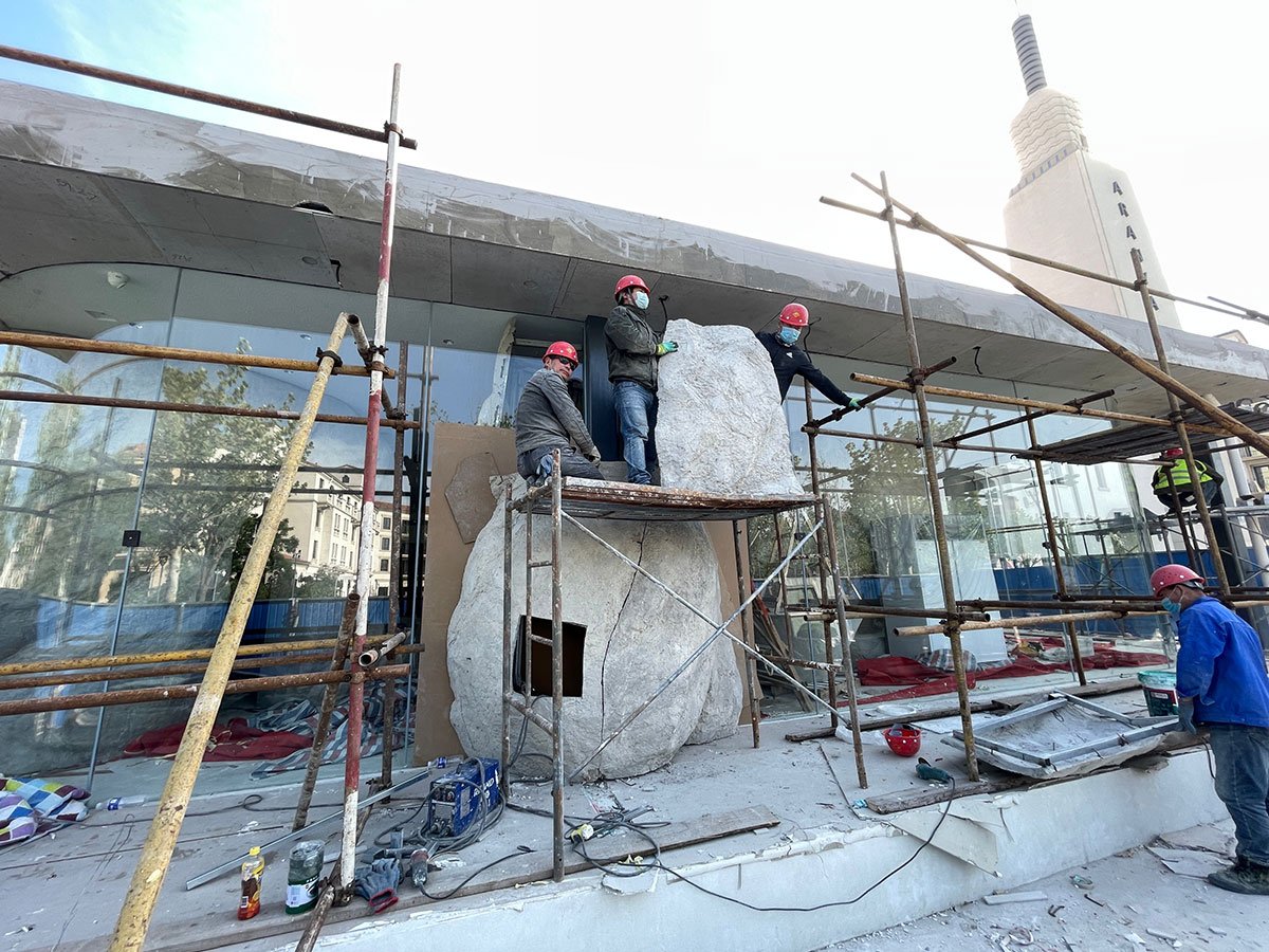 With the deepening of the design project, we gradually enlarged the scale of models and eventually finalized the spatial form and organization with a 1:30 model, and then the production of model making was started at a professional factory. At first, a 1:10 handmade clay model was created. Clay, as a natural material, provides us with a more intuitive understanding and grasp of the form and aesthetics of the space. Subsequently, the scale of the model continued to be enlarged during constant adjustments until the 1:1 clay sculpture model was finalized. The entire production process relied on neither the help of computer 3D modeling nor construction documents. Instead, it was all done by the hand of the designers and the contractor. Then after the turnover formwork and GRC module pouring process, the finished and individual modules were transported to the site for assembly. Finally, the architecture was successfully completed.
