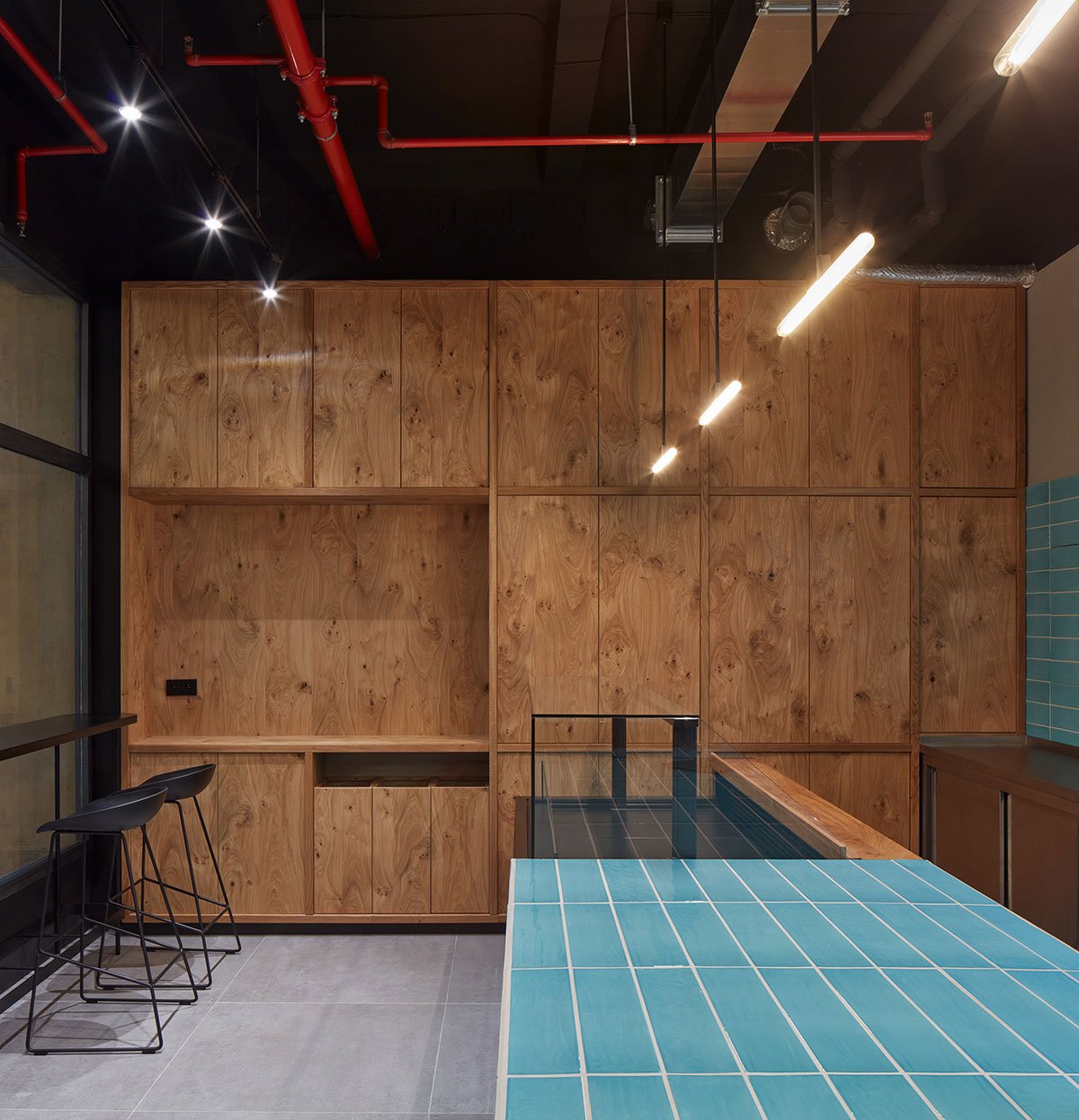 The blue neon with the bistro’s logo harmonizes with both the tiles and the linearly profiled wooden walls, which conceal important storage spaces. The offered menu focuses on quality ingredients and visual presentation, in line with the interior design.