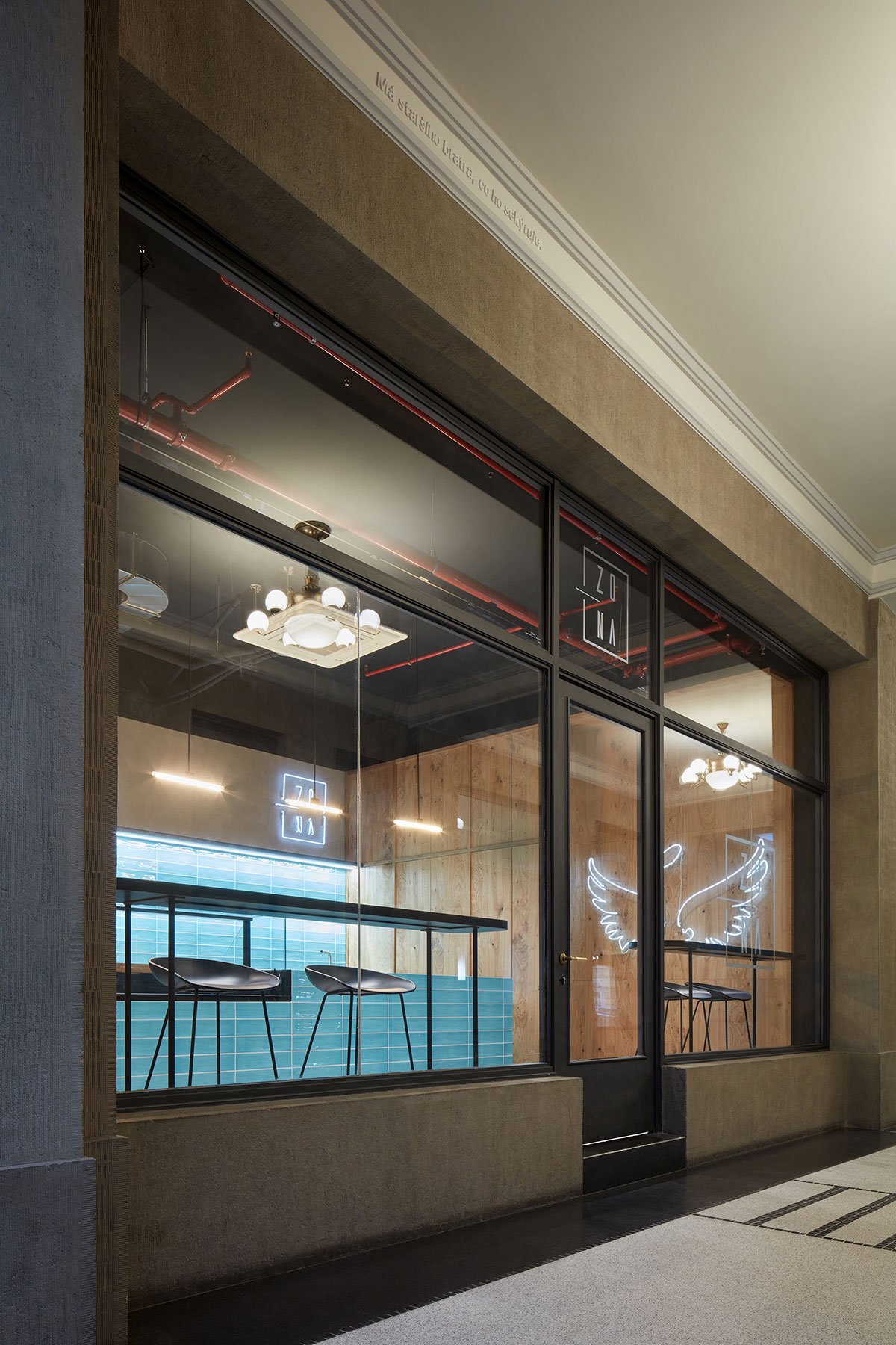 [Text as submitted by architect] In the heart of Prague, there’s a passage that harbors several quality gastropubs, and one of them is Zóna, a bistro specializing in street food. A prominent feature in the space is the bar, entirely clad in blue tiles.