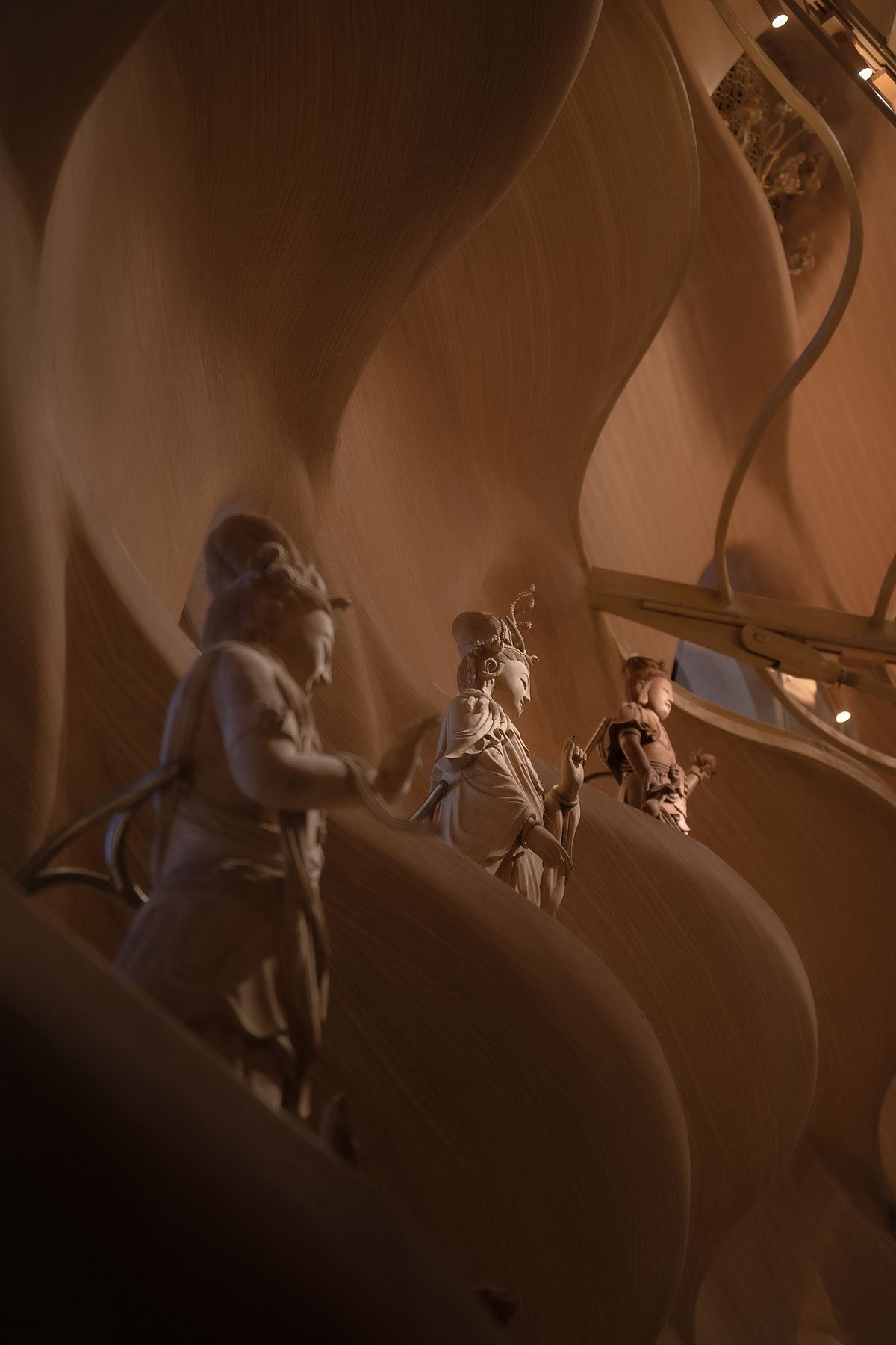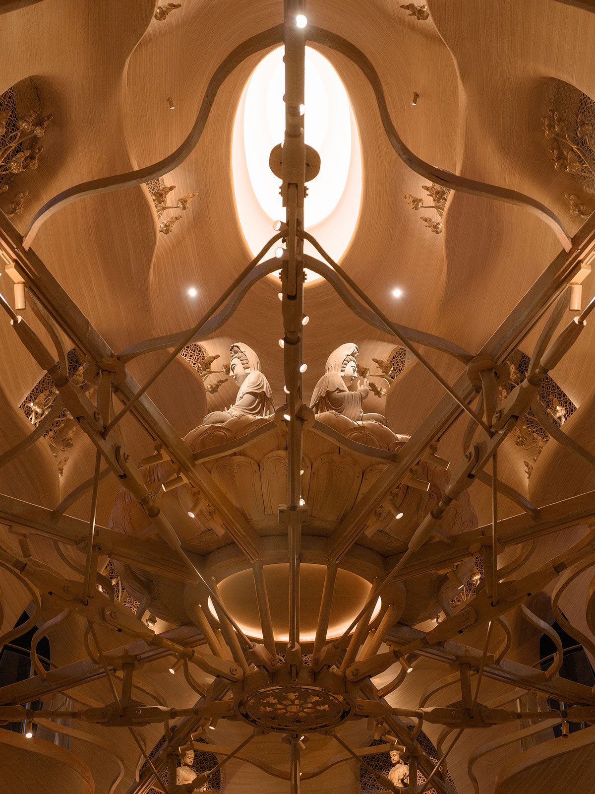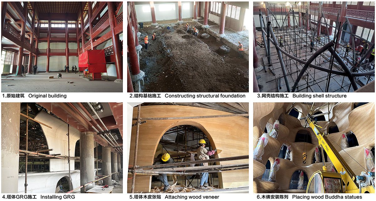 The design borrows from the architectural prototype of “pagoda”, creating a hollow Buddha pagoda in the center of the hall as the main carrier for a vertical exhibition of wood Buddha statues. Appearing oval in floor plan, the pagoda has seven layers that grow narrower upwards to meet at the square ceiling of the hall. The interior of the pagoda borrows imagery from the Mandala, a consecrated area where all the sages and men of virtue are brought together and a symbol of the universe in Buddhism.