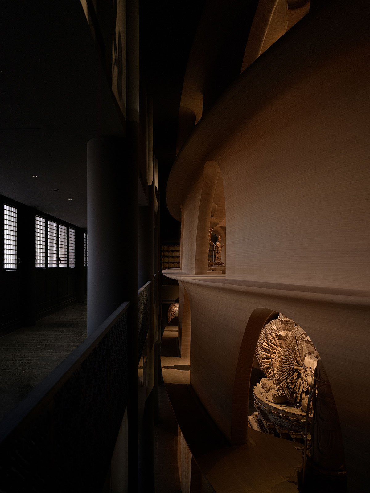 [Text as submitted by architect] A museum hidden in a temple: The Wood Buddha Statue Museum is located at Ji Xin Monastery in Zushan Scenic Area of Qinghuang Dao City. With a history dating back to the Song dynasty (960–1279), the temple nestles half way up the mountain, overlooking the city and Bohai Sea like a hermit. As a major tourist spot in the Zushan Scenic Area, the existing temple was rebuilt on its original site in 2002. Facing eastward, the temple complex unfolds across the mountain terrain, forming a spatial layout in three courtyards. The museum is located in the back courtyard. As visitors navigate through a corridor of the temple’s main hall, they will see three halls standing on top of a high platform: the Guanxin Hall, the Hall of Medicine Buddha, and the Hall of Amitabha Buddha, which are venues for the wood Buddha statue museum.