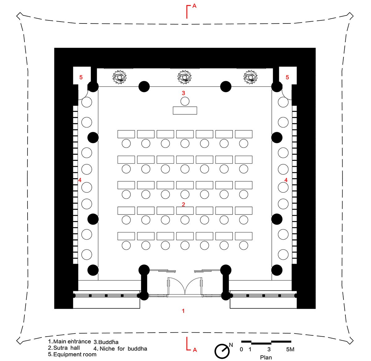A terrace outside a hall: A significant elevation difference of nearly 10 meters separates the main hall and the wood Buddha Museum, which are connected by an existing steep stairway on the site. In the middle of the stairway stands a stone Guanyin statue, marking a significant area that visitors pass through before they reach the museum. Thus, this area has also been involved in the renovation project.