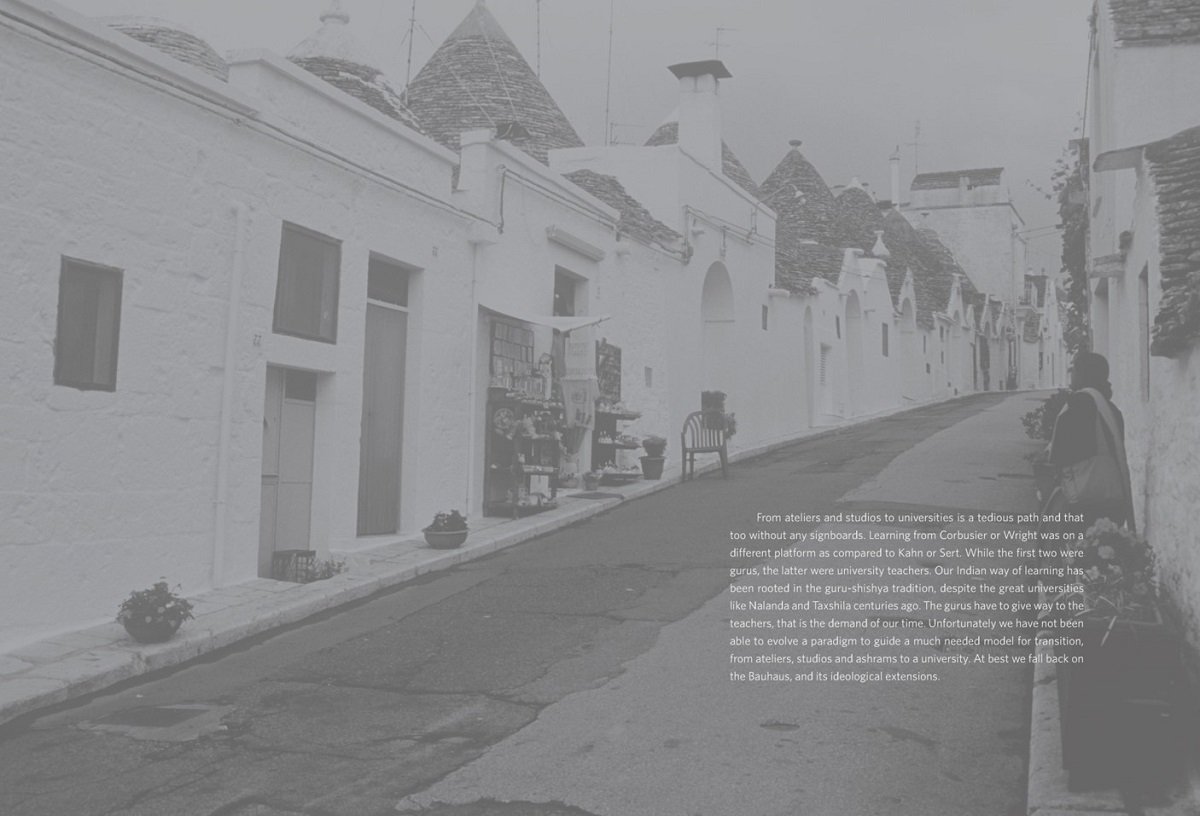 When the author started thinking about writing a book on education it became very dense and enmeshing—syllabi, curricula, pedagogy, methodologies, and more. Education is heavy, learning is not; so he thought of working on learning. This prompted him to think about involving young teachers and sharing their views on specific topics. This engagement encourages writing about architecture—an important need of the hour.