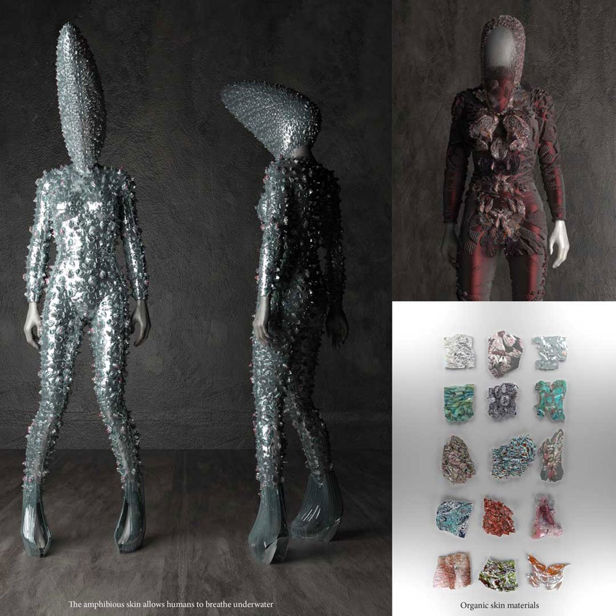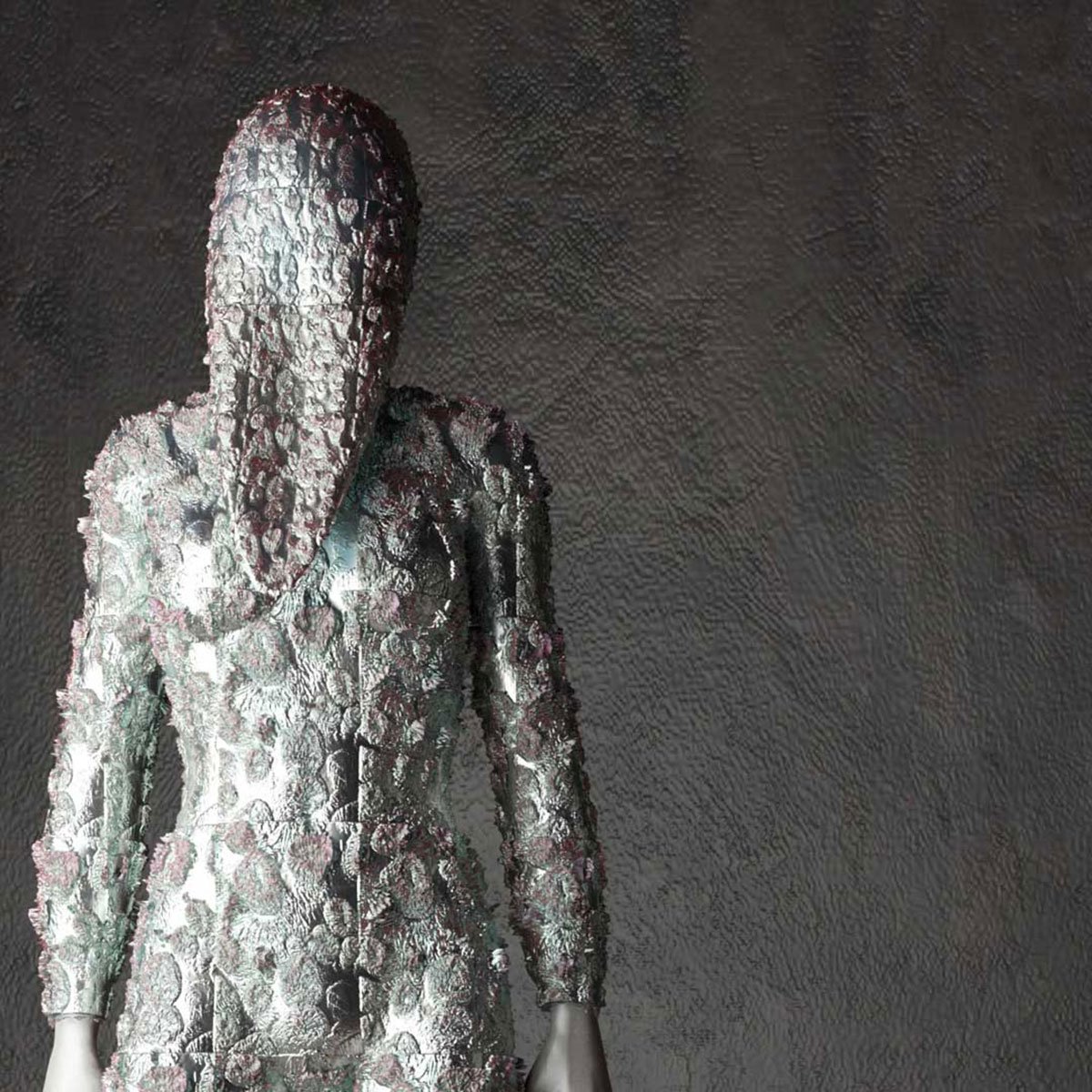 The design is informed by technological advancements to generate displacements that replicate the visual properties of organic compounds both as a wearable and as a cladding material. The vision is that the alternative reality becomes adaptive and responsive.