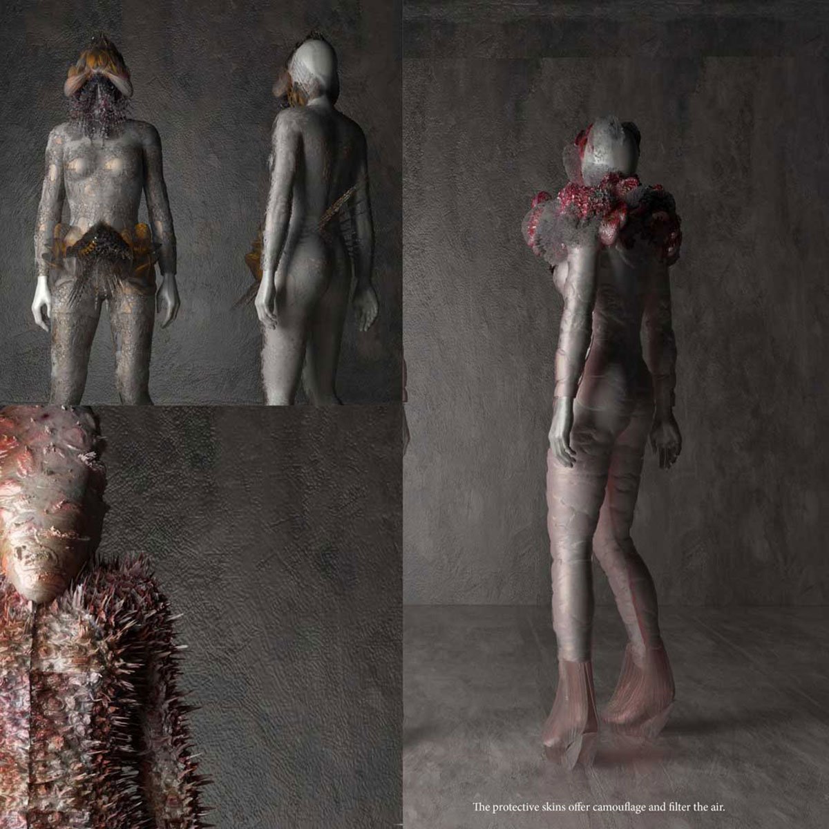 A series of protective skins which respond to the environment have been developed from organic compounds. By harnessing the attributes found in nature such as breathing underwater and camouflage, which have since been unattainable to humans, the skins allow buildings and humans to amplify and exaggerate their capabilities and respond to the environment. Invisibility and flying are now possibilities and are no longer human limitations.