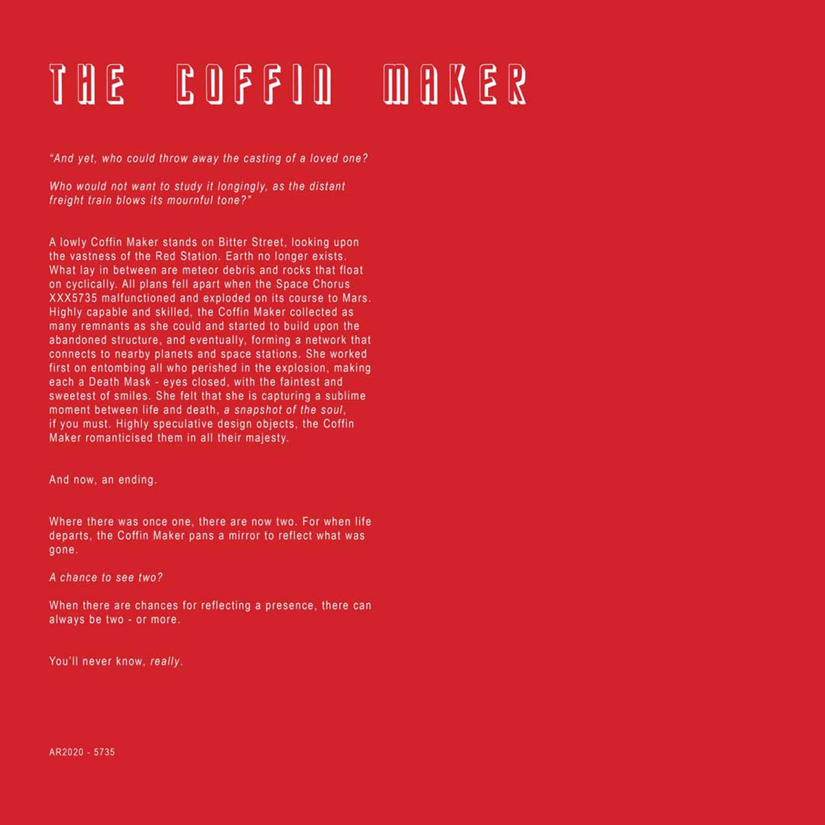 A lowly Coffin Maker stands on Bitter Street, looking upon the vastness of the Red Station. Earth no longer exists. What lay in between are meteor debris and rocks that float on cyclically. All plans fell apart when the Space Chorus XXX5735 malfunctioned and exploded on its course to Mars. Highly capable and skilled, the Coffin Maker collected as many remnants as she could and started to build upon the abandoned structure, and eventually, forming a network that connects to nearby planets and space stations. She worked first on entombing all who perished in the explosion, making each a Death Mask – eyes closed, with the faintest and sweetest of smiles. She felt that she is capturing a sublime moment between life and death, a snapshot of the soul, if you must. Highly speculative design objects, the Coffin Maker romanticized them in all their majesty.