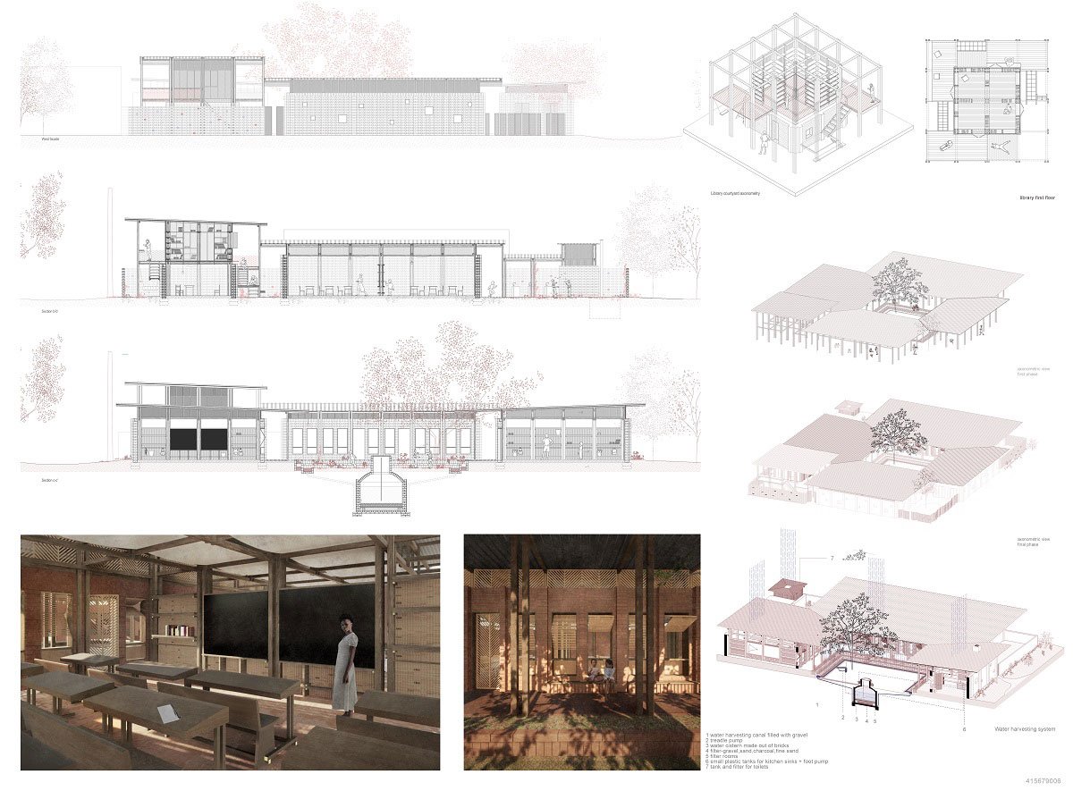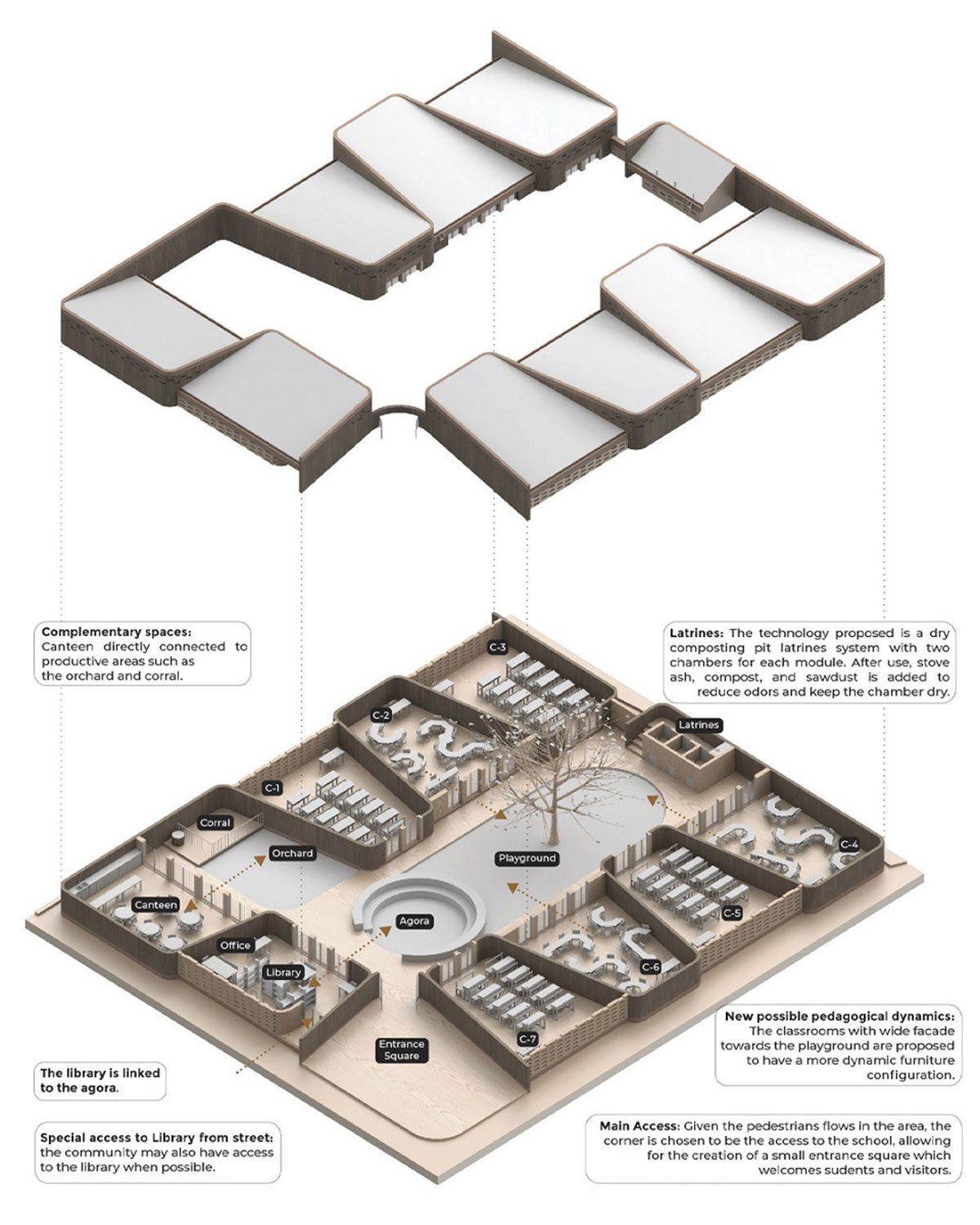 Trying to solve this question, we challenge ourselves to develop a project that would seek to weave society that could benefit, become an important center and enhance the quality of the community. Consequently, the project proposes an outdoor space that welcomes the visitors, a small square open to everyone that serves as an extension area for the school and the library which is carefully located to be a knowledge platform not only for the students but the whole community outside.