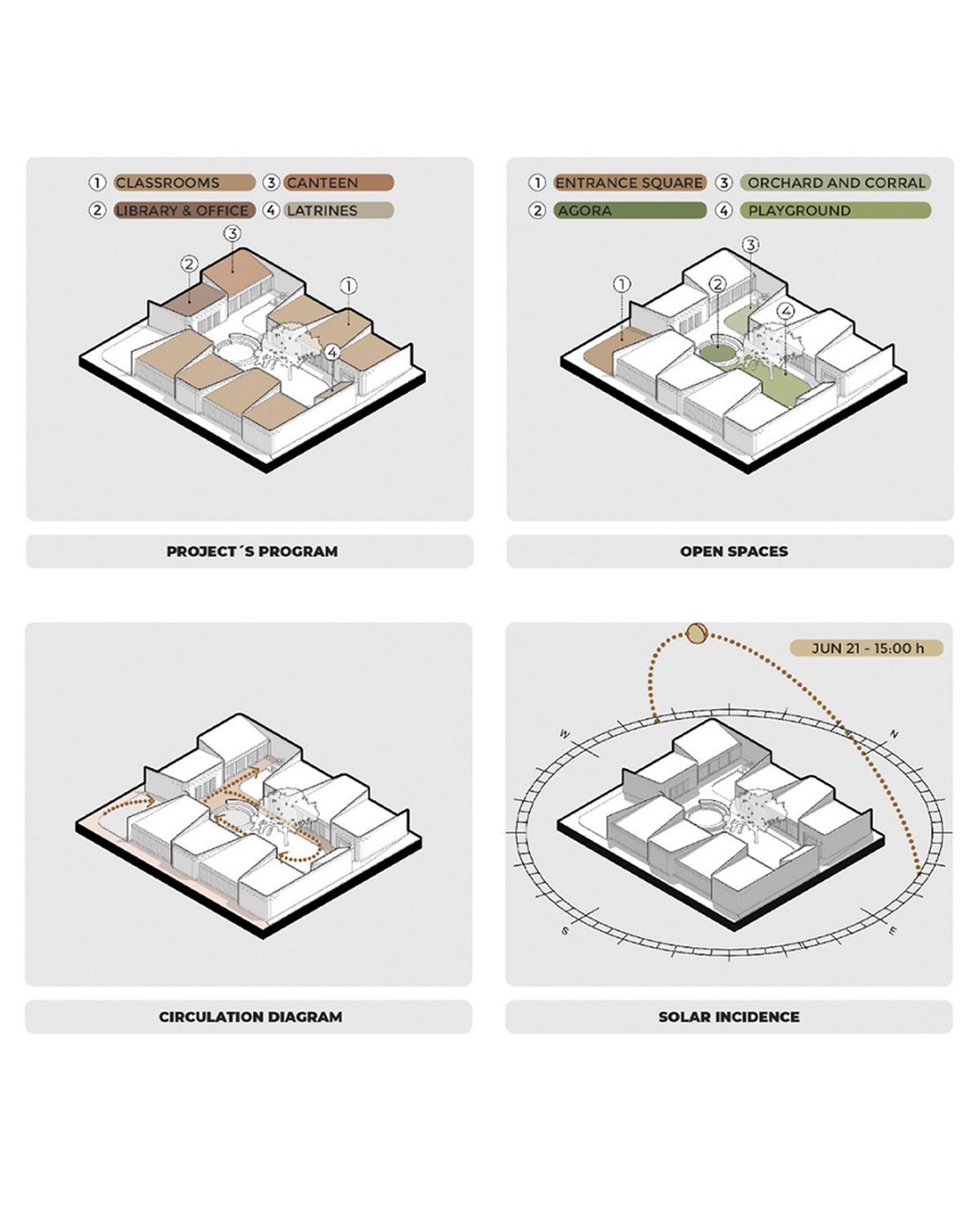 The project is planned on one single level to reduce the construction cost; the spaces are arranged so as to create an open central area aiming to respect and highlight the existence of the tree where different kind of activities take place. The spaces are also designed to confirm the perimeter of the plot, giving an image of unity and defining clear boundaries easy to control. The orchard and corral areas are located in front of the canteen, thus facilitating the provision of the necessary supplies in the preparation area.”