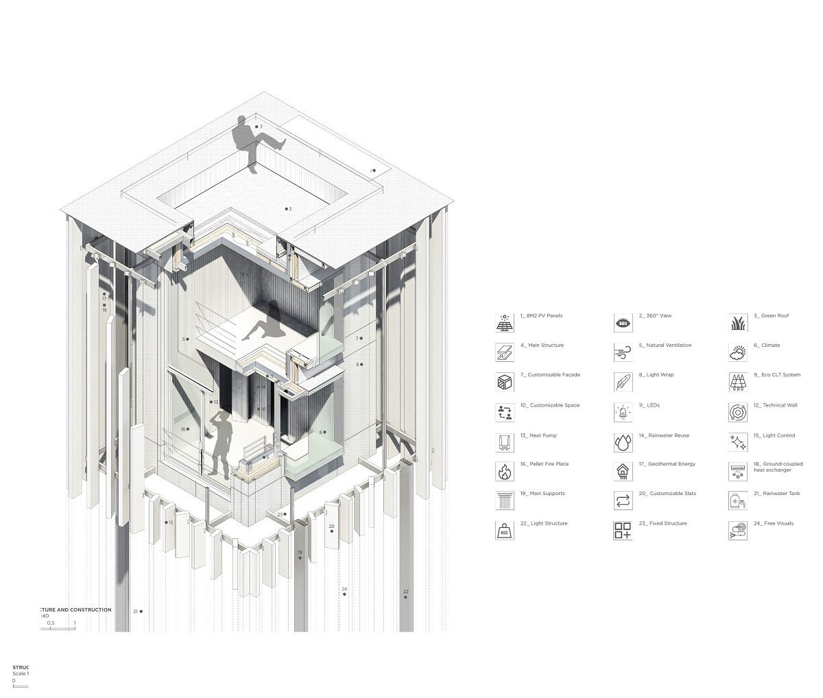 The Ecottage is designed to be environmentally responsible; it aims to be a solution to fight the adverse effects of climate change through its adaptive spatial design. This house is made of prefabricated mass, adapting to every individual habitat needs. Created with an intent to preserve natural resources, the Ecottage has the potential to be completely energy independent, a vital characteristic necessary to sustain life in the coming years.