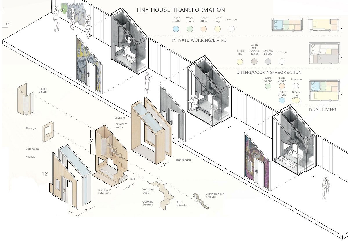 The “Off the Walls” tiny house is designed with the concept of sheltering homeless people in the Bushwick neighbourhood of New York during today’s difficult pandemic situation. Its design celebrates the vibrant street art culture of the neighbourhood, making it an indelible part of its dynamic surroundings and communities. Made of recycled elements, the house envisions sustainability and adaptability as means to invigorate the neighbourhood and its communities.