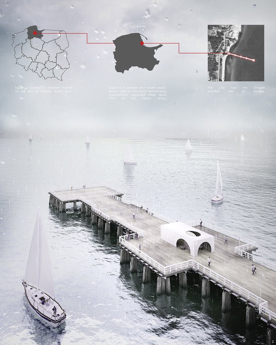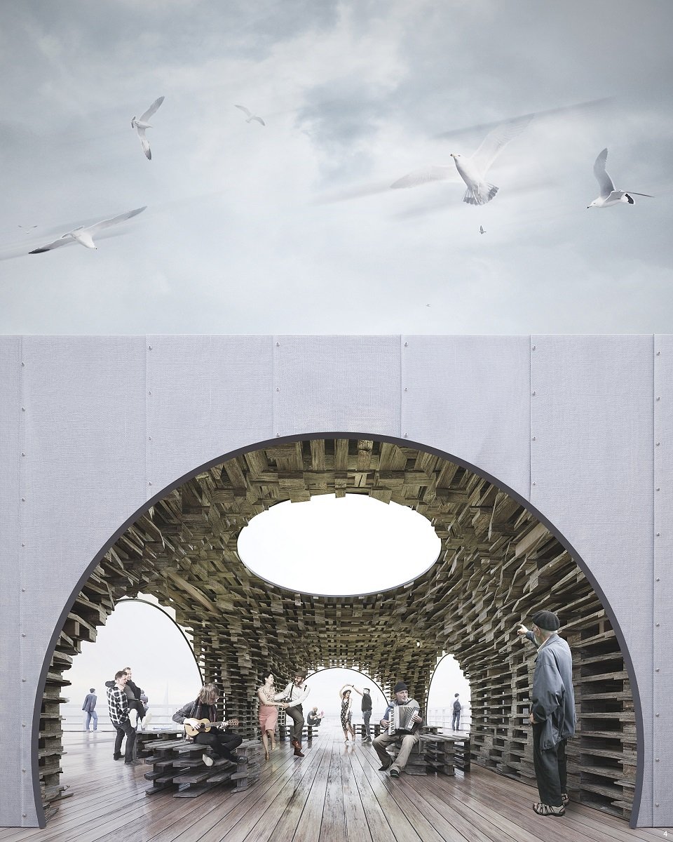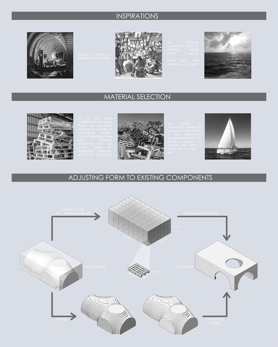 The pavilion is a proposal to use defective pallets and consider them as a wooden modular element adjusted to the aesthetics and history of the seaside town of Sopot.
